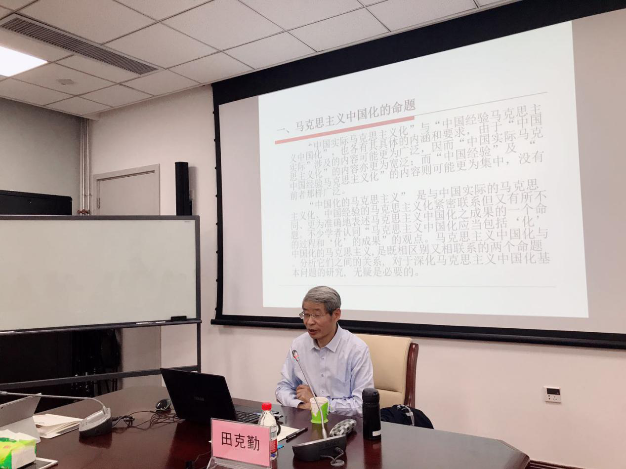 5月14日上午,东北师范大学田克勤教授做客“百川讲堂”,在公司沙河校区公司1号楼102室发表了主旨为“马克思主义中国化研究学科基本概念及其主要范畴”的学术报告。田克勤教授是东北师范大学荣誉教授、当代中国马克思主义研究中心主任,太阳成集团tyc7111cc教授、博士生导师,中国社会科公司兼职博士生导师、中央马工程重点教材编写组首席专家、吉林省社会科学界联合会副主席、中国共产党历史与理论研究会会长,从1993年起享受国务院政府特殊津贴。长期从事中共党史、马克思主义中国化研究与思想政治教育学科的教学与研究。本次讲座由太阳成集团tyc7111cc、北京高校中国特色社会主义理论研究协同创新中心(太阳成集团tyc7111cc)共同举办。太阳成集团tyc7111cc经理冯秀军教授主持讲座,公司师生共计40余人聆听了本次讲座。