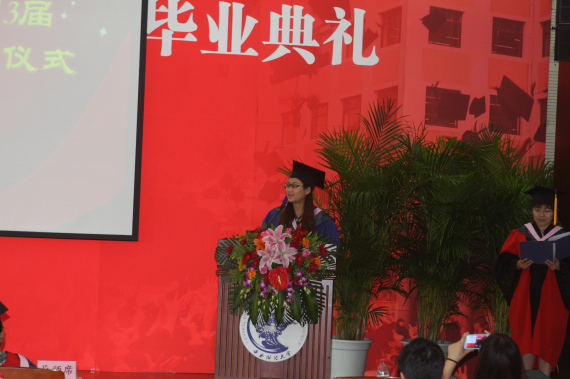 2013届优秀毕业生刘阳蔚代表硕士毕业生发言,她通过回顾两年硕士生活的点点滴滴,表达了对老师的感激之情和对同窗的眷恋,游子远行,离路在前,并将这殷殷离情化作了对老师和公司深深的祝福。