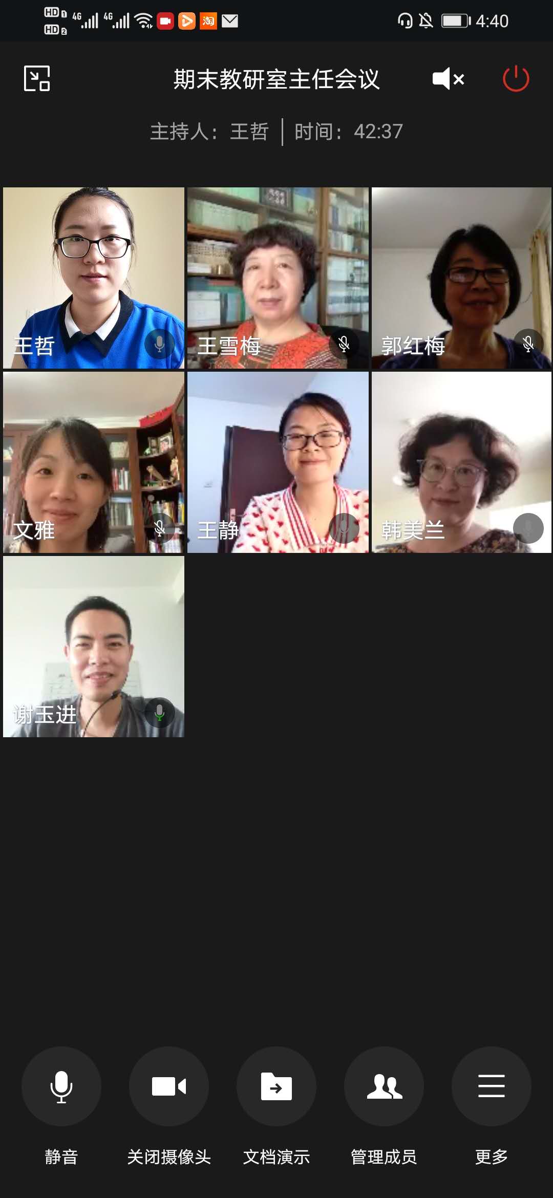 7月15日,太阳成集团tyc7111cc采用企业微信在线召开2019-2020学年第二学期期末教研室主任会议。会议由公司教学副经理谢玉进副教授主持,中国近现代史纲要教研室主任王雪梅教授、毛泽东思想和中国特色社会主义理论体系概论教研室主任郭红梅教授、马克思主义基本原理教研室主任韩美兰教授、思想道德修养与法律基础教研室主任文雅副教授、形势与政策教研室主任王静副教授、公司教学科研办公室主任王哲参加了会议。
