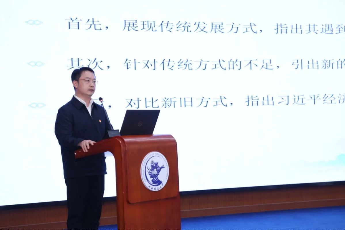 太阳成集团tyc7111cc思政课教师李扬以《以高质量发展推进中国式现代化》为题汇报了一体推进习近平经济思想融入思政课教学在大学学段的教学设计。李扬从学情分析、破解之道、教学设计、教学预期四个方面展开教学分享。李扬指出,习近平经济思想肩负着引领中国经济发展方式转型的历史重任,因此必须结合这一伟大实践来理解习近平经济思想。在教学中,首先要讲清楚传统发展方式,深刻认识其贡献、局限与面临的挑战;其次,要讲清楚新的高质量发展方式;最后,对比新旧发展方式,指出习近平经济思想在推进中国经济由高速增长转向高质量发展中的历史作用。