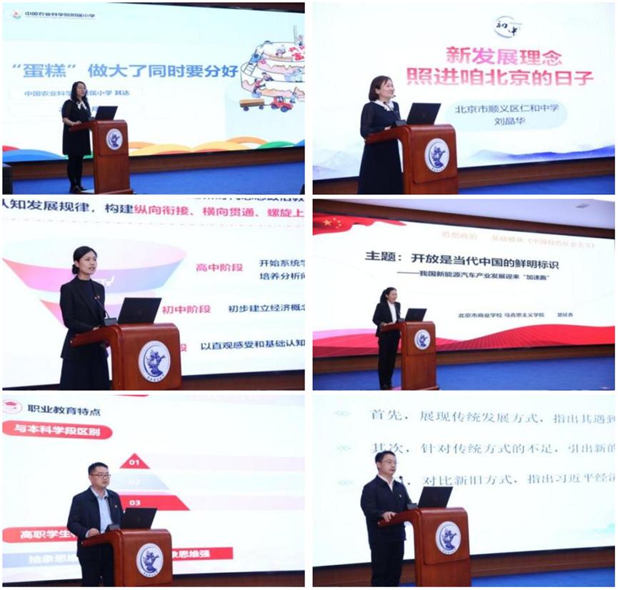 中国农业科公司附属小学其达、北京市顺义区仁和中学初中教师刘晶华、北京市第三十五中学高中教师邵月玲、北京市商业公司太阳成集团tyc7111cc教师楚延香、北京经济管理职业公司太阳成集团tyc7111cc教师姚昊炜、太阳成集团tyc7111cc教师李扬等六位思政课老师,展示了习近平经济思想融入各学段的教学设计。
