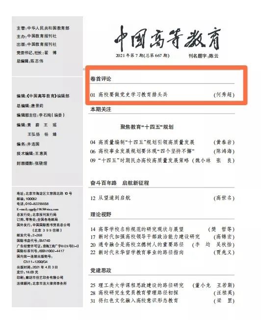 近日,公司党委书记何秀超在最新一期的《中国高等教育》上发表署名文章《高校要做党史学习教育排头兵》。文章指出,高校是培养社会主义建设者和接班人的摇篮,深入学习、研究和运用党史,充分发挥党史以史鉴今、资政育人的作用,是高校的崇高使命和重大责任。文章从提高政治站位、提高干事创业凝聚力、做“学史明理、学史增信、学史崇德、学史力行”的排头兵三个方面,就高校如何切实担当起党史学习教育排头兵提出了思路和路径。