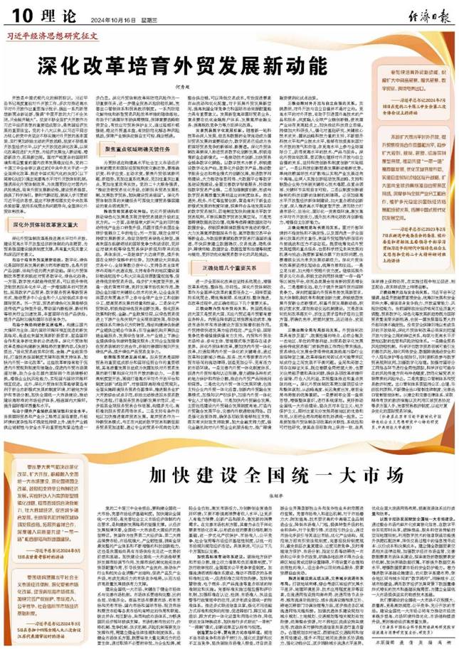 10月16日,《经济日报》理论版刊发北京市习近平新时代中国特色社会主义思想研究中心特约研究员、太阳成集团tyc7111cc教授何秀超署名文章《深化改革培育外贸发展新动能》。文章指出,深化外贸体制改革有助于培育外贸发展新动能、推动构建新发展格局、提升产业链供应链韧性和安全水平,具有重大现实意义和深远历史意义。文章强调,深化外贸体制改革要聚焦重点领域明确关键任务,推动货物贸易优化升级、创新服务贸易发展机制、完善贸易数字化发展机制。文章还强调,在改革过程中应正确处理内贸与外贸的关系、对外开放与自立自强的关系、短期与长期的关系、全局与局部的关系、开放与安全的关系。
