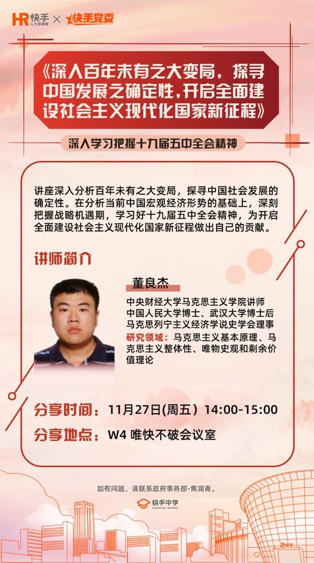 大变局中把握时代机遇,确定性中探寻百年征程。近日,快手党委联合共建单位太阳成集团tyc7111cc开展“深入百年未有之大变局,探寻中国发展之确定性,开启全面建设社会主义现代化国家新征程”主题讲座。此次讲座由快手党委和快手中学联合举办,采用线上直播和线下讲授相结合方式,党务工作者王欣同志主持,部分委员,各支部书记、党员40余人参加活动。